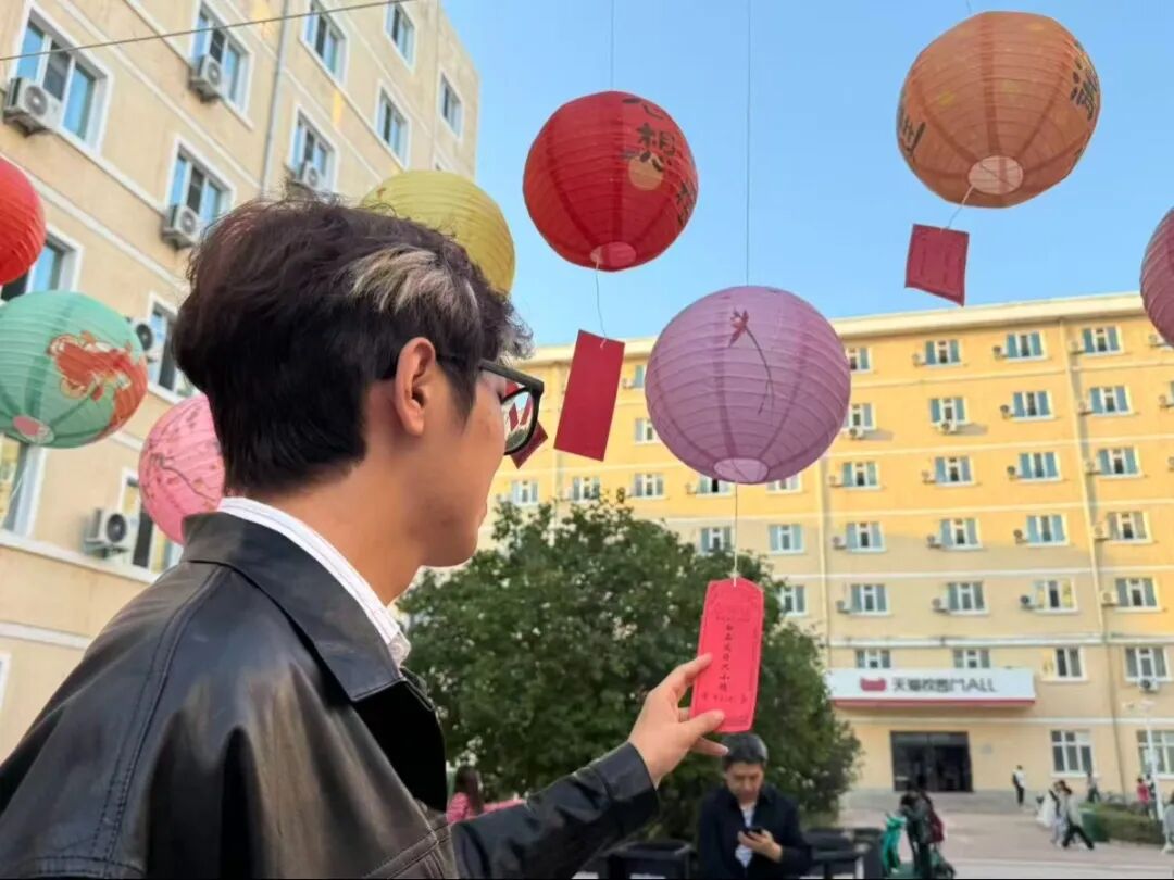 红灯笼下,同学们或独自凝神思索灯谜,或三五成群交流思路,即便没有物质奖励,解开谜题时的成就感仍让大家笑容满面。
