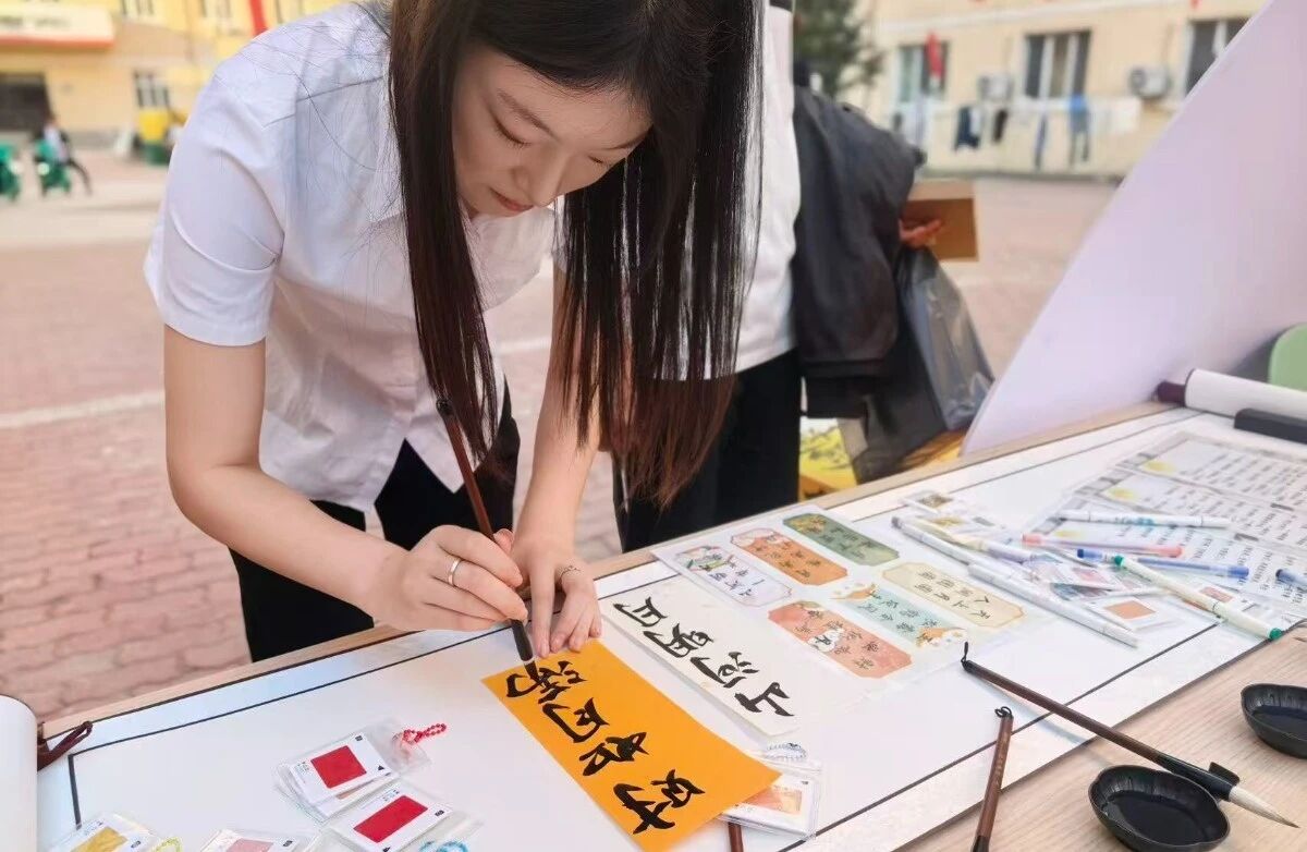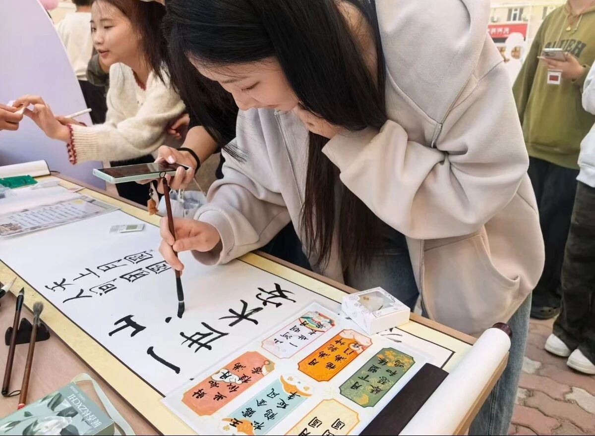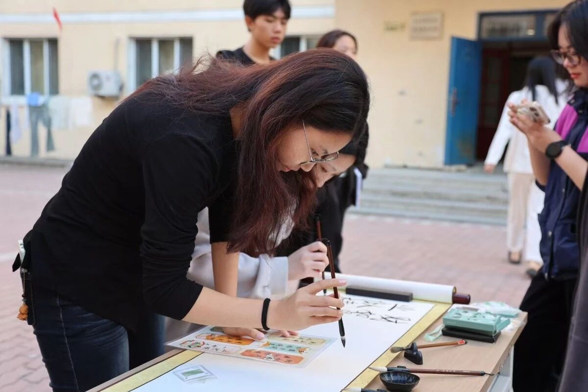 长卷书法区,笔墨纸砚整齐陈列,同学们自发排队,提笔写下中秋祝福,“但愿人长久”“中秋安康”等字迹在长卷上渐渐铺展,墨香与月光交织,成为现场最雅致的风景。