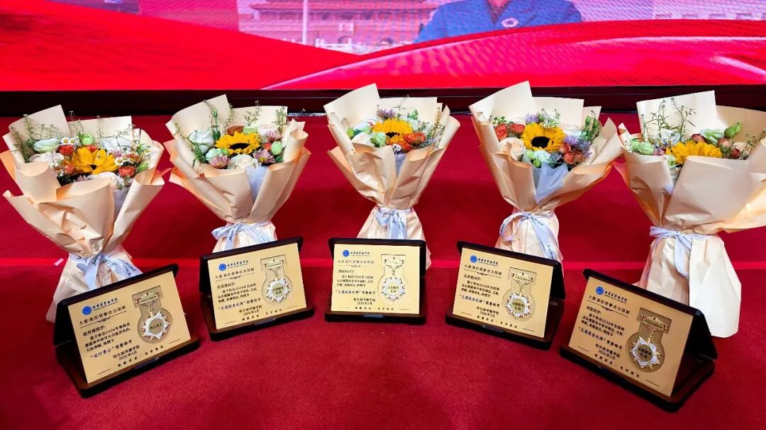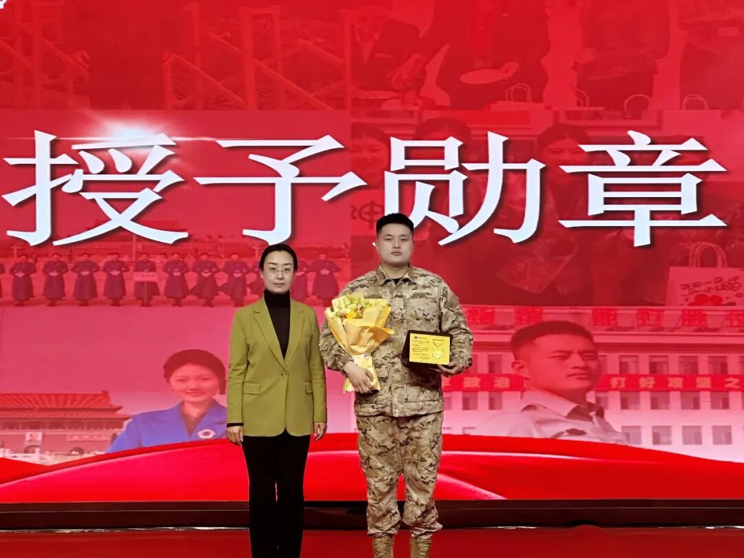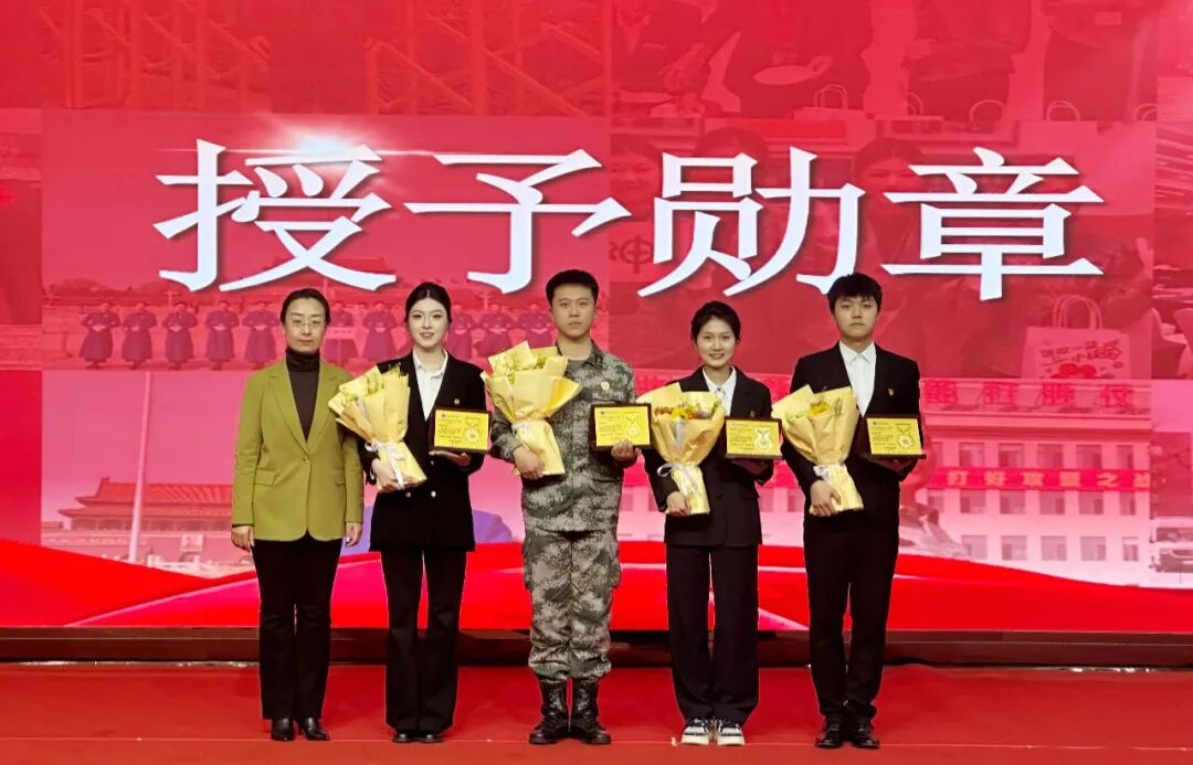 本次大会授予潘贵轩、孔祥爱、刘恒、张奕雯4名两会志愿者“志愿服务先锋”荣誉称号、授予英勇救火的赵世博同学“逆行勇士”荣誉称号,副校长魏可霏为五位优秀志愿者授予荣誉勋章,这枚勋章不仅是对他们辛勤付出的充分肯定,更是对全体学生的殷切期许,激励着每一位华德青年以榜样为标杆,在奉献中书写青春华章。