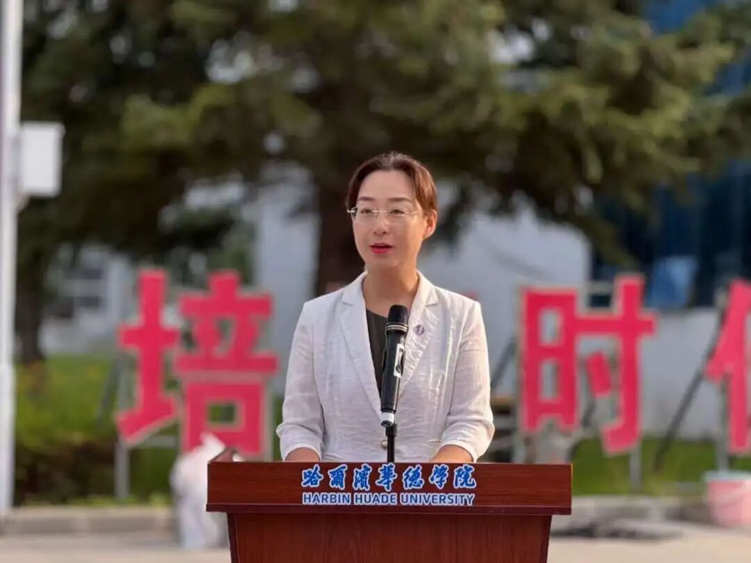 校长助理魏可霏作国旗下讲话。她代表学校向2025级专升本新生表示热烈欢迎,并围绕“奋斗担当”“吃苦耐劳”“勤能补拙”三个关键词,寄语新生要以青春之我、奋斗之我,勇担时代使命,在实践中锤炼本领,在挑战中超越自我。她强调,华德学院33年的办学历程中,始终秉承“立德树人、实践育人”的理念,培养出一批又一批优秀学子,希望新生们以他们为榜样,书写属于自己的华德篇章。