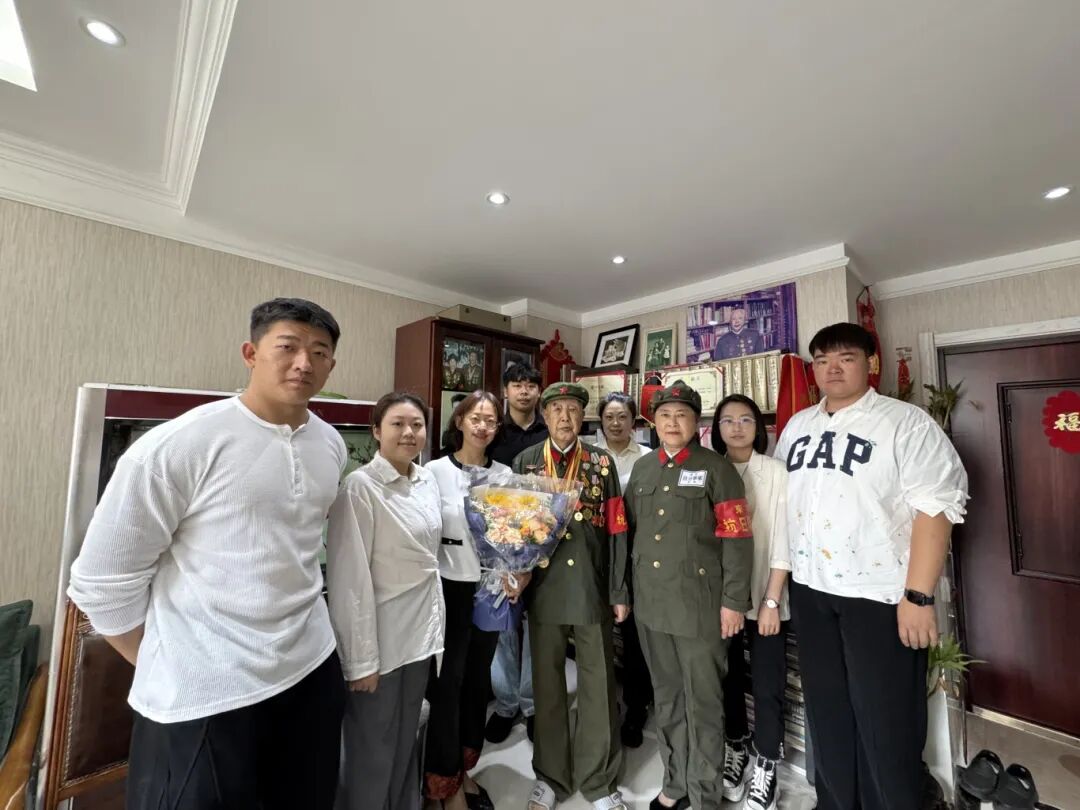 在走访过程中,师生代表看望了抗战老战士、哈尔滨市中国人民抗日战争暨世界反法西斯研究会理事王济堂老先生,为他送上慰问品,并致以崇高敬意与诚挚问候。王济堂老先生年仅13岁便投身东北抗联,参加地下秘密情报工作,在敌后战场屡建奇功,是一位历经战火的革命前辈。老先生深情回忆起烽火岁月的战斗经历,动情讲述那段艰苦卓绝却信念如磐的历史。“宁可前进一步死,绝不后退半步生”——一句句铿锵誓言、一段段真切往事,让在场师生无不动容,深刻感受到革命先辈为国家独立与民族解放所展现出的英勇无畏。