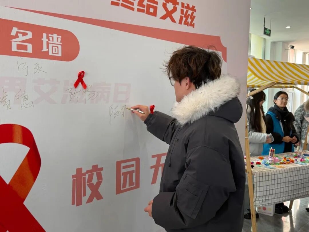 本次活动采用了富有挑战性的集章兑换奖品形式,参与者需在精心设置的三个活动区的游戏中逐一挑战成功,方可兑换心仪的奖品。软萌可爱的捏捏玩具、设计精巧的挂件、温暖治愈的玩偶等小礼品,吸引着同学们争相参与到活动中。校园健康护卫站的志愿者们在现场引导同学们在“红丝带签名墙”上签下自己名字,同学们的每一笔每一划都显得格外郑重。这不仅是对活动本身的热情支持,更是这场活动中最温暖人心的注脚,传递出大家携手共进、共同抵御疾病的坚定信念。