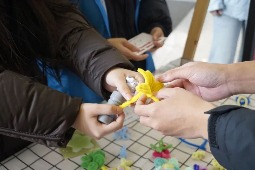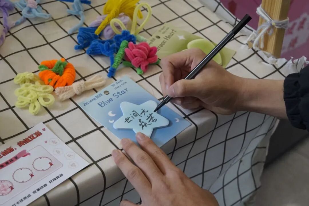 在温馨活动区内,同学们纷纷拿起笔,认真写下自己对预防艾滋病的深刻体会和真挚的暖心祝愿。每一句话都饱含着对生命的尊重与对健康的期盼,字里行间透露出浓浓的关怀与温情。爱心社团的成员为参与同学送上亲手制作的扭扭棒花束——象征着团结与希望的小小信物,通过这样温馨而富有意义的互动,大家不仅传递了关爱与温暖,更在无形中凝聚起了对抗艾滋病的坚定共识。