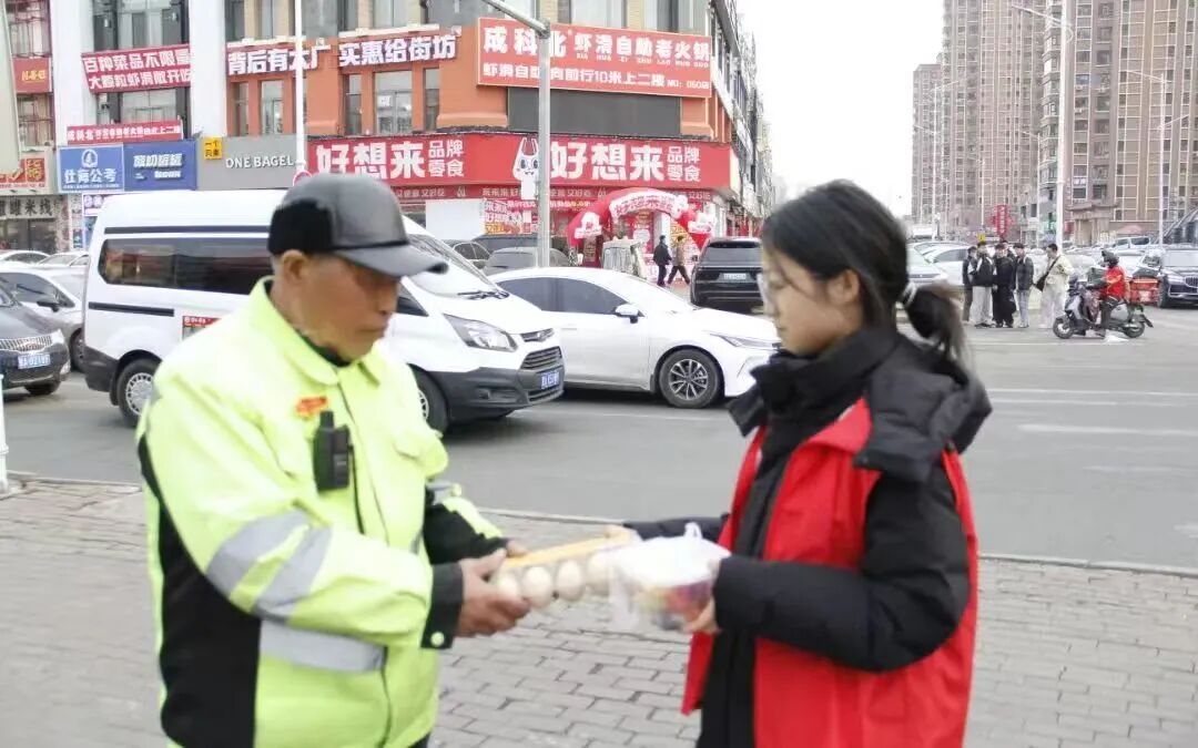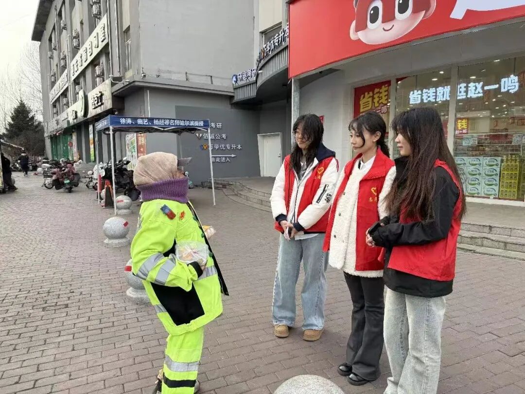 同学们为坚守岗位的环卫工人送上鸡蛋与水果,用一句句问候传递敬意,在一段段倾听中感悟坚守。通过与环卫工人面对面交流,同学们深入了解日常作业的艰辛与不易,在劳动教育中强化奉献意识,在情感共鸣中厚植为民情怀。