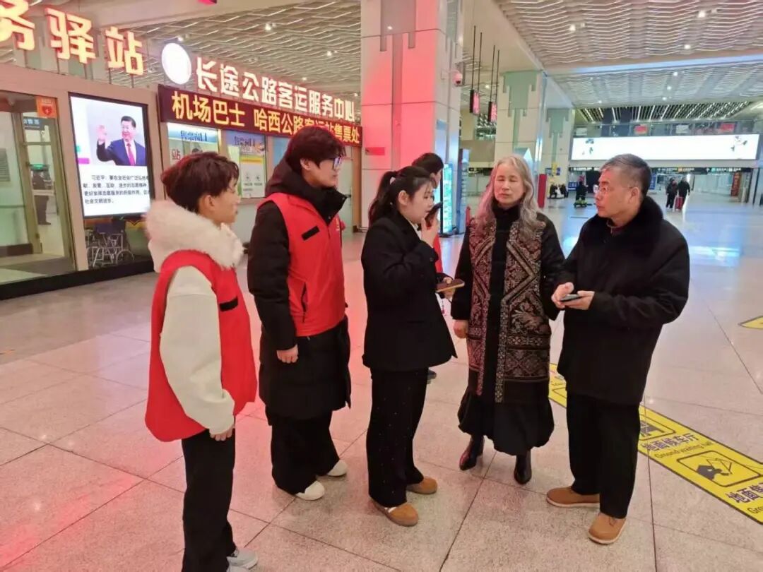 志愿者们在进出站口、换乘通道等关键点位,为过往旅客提供路线指引、换乘咨询与票务协助,细心帮扶老年乘客与携带行李旅客,用暖心服务保障车站通行安全有序,以实际行动彰显艺术学子的责任担当。